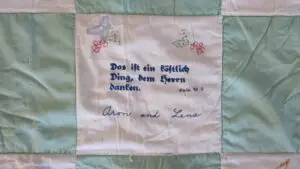 In celebration of the 25th wedding anniversary of Helena (Wiens Kroeker) Dyck and Peter Dyck, a quilt cover measuring 7 feet wide …
